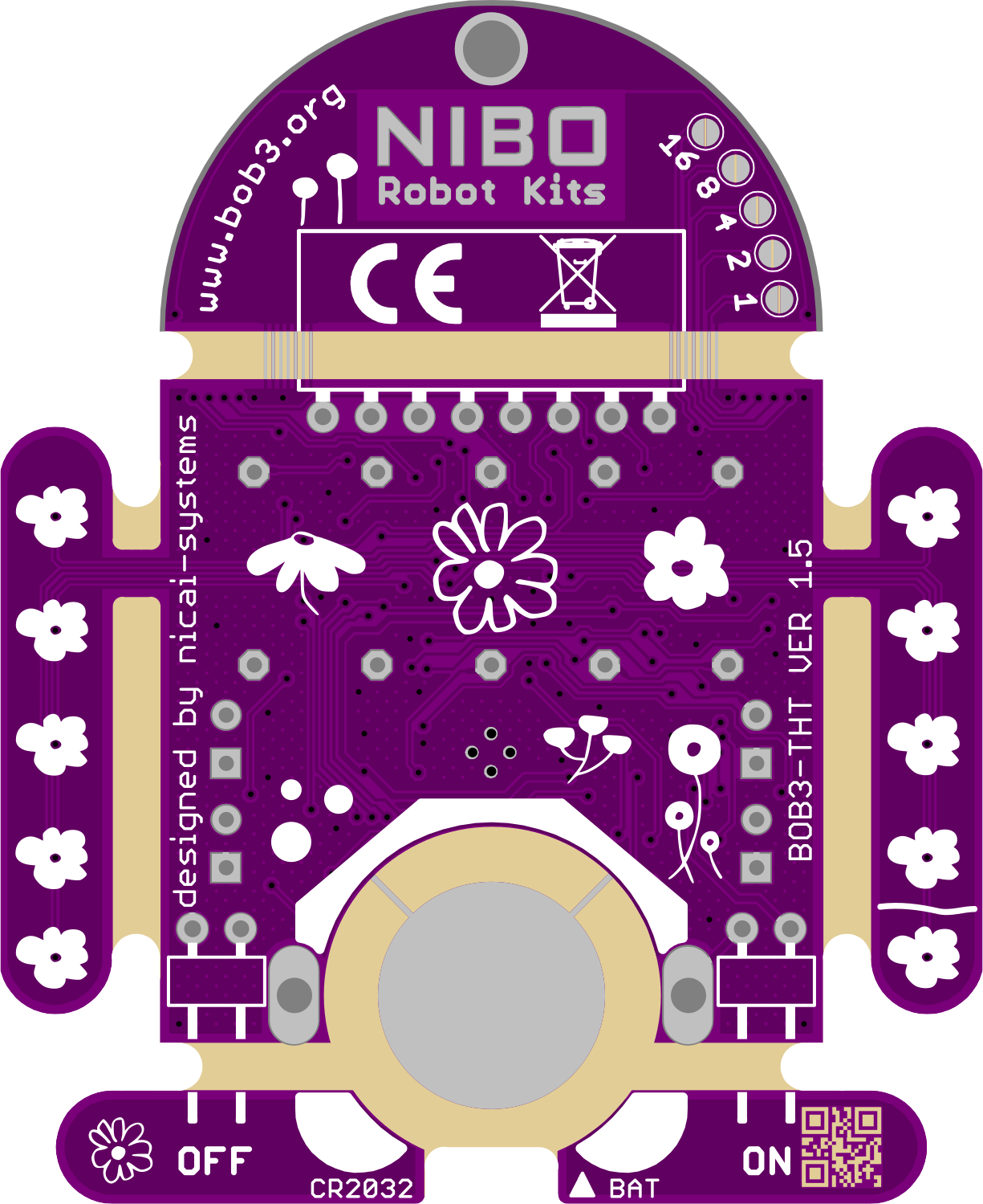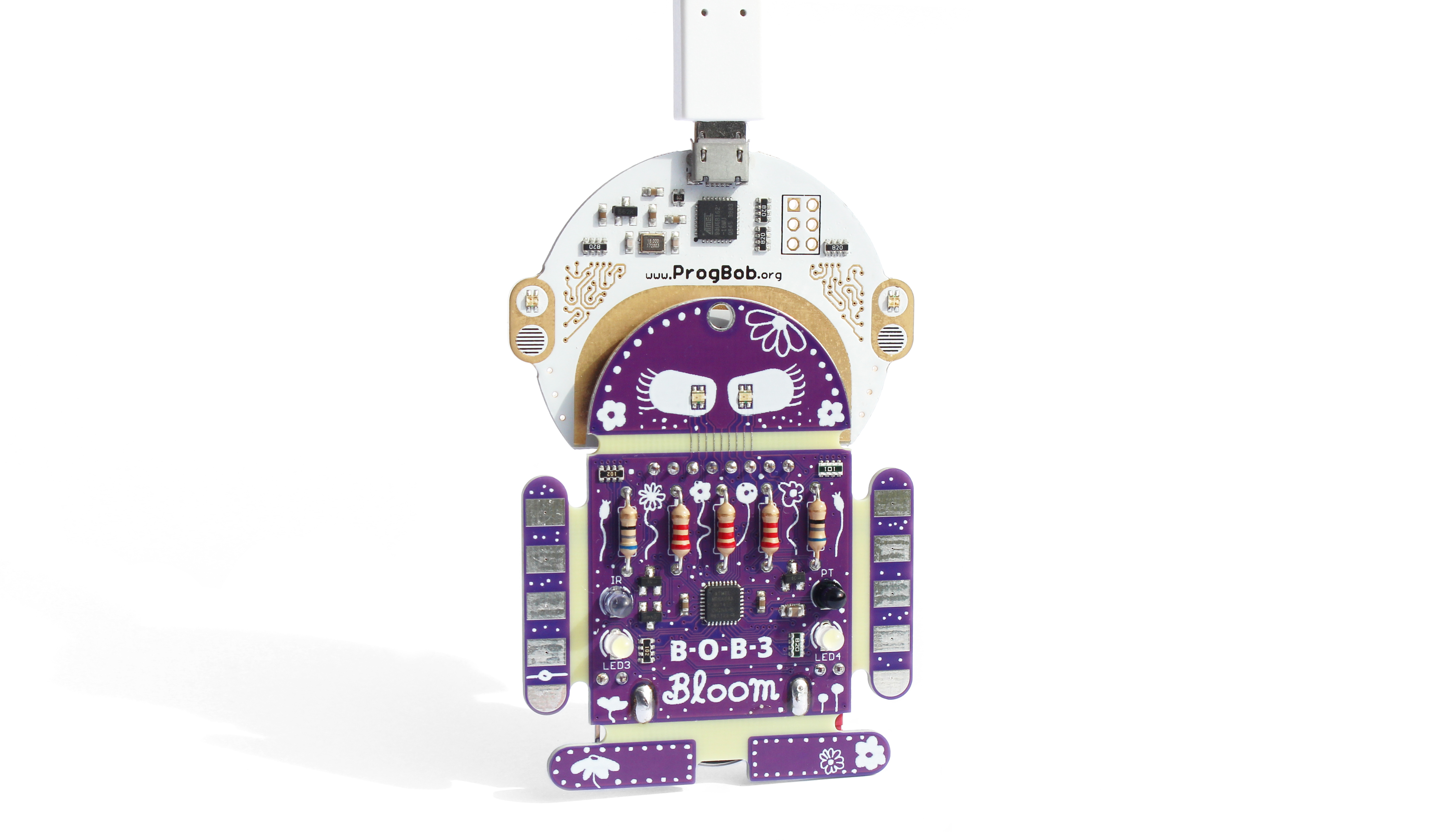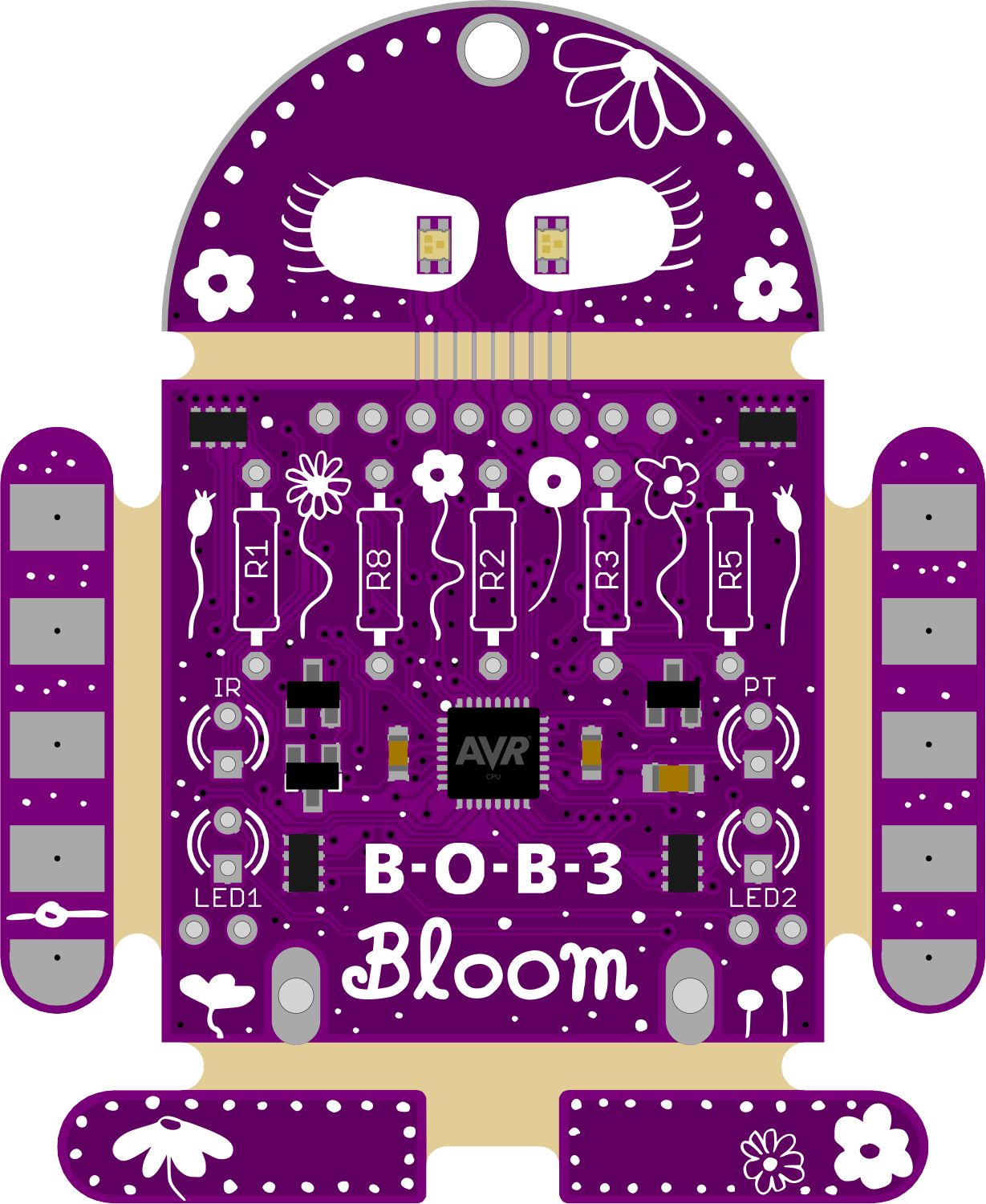 B·O·B·3 Bloom ist ein Roboterbausatz, der aus insgesamt 26 Bauteilen besteht: Der Mikrocontroller und 12 weitere SMD-Bauteile sind bereits vorbestückt, die 13 THT- Bauteile sind zum selber einlöten. Eine Bauanleitung mit vielen Bildern und eine Lötfibel zum Löten lernen erklären die notwendigen Schritte zum Aufbau.